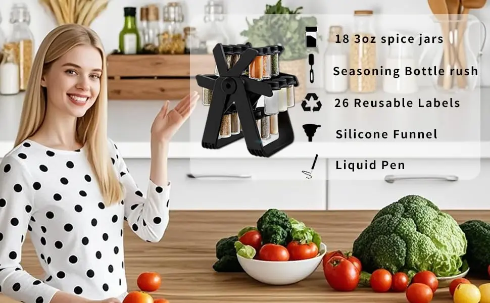 Profitez d'un voyage gustatif passionnant avec cet ensemble de 18 flacons d'épices et de pots à épices qui tournent à 360 degrés, alliant élégance et fonctionnalité dans un seul produit. Cet ensemble fantastique vous permet d'organiser vos épices de maniè